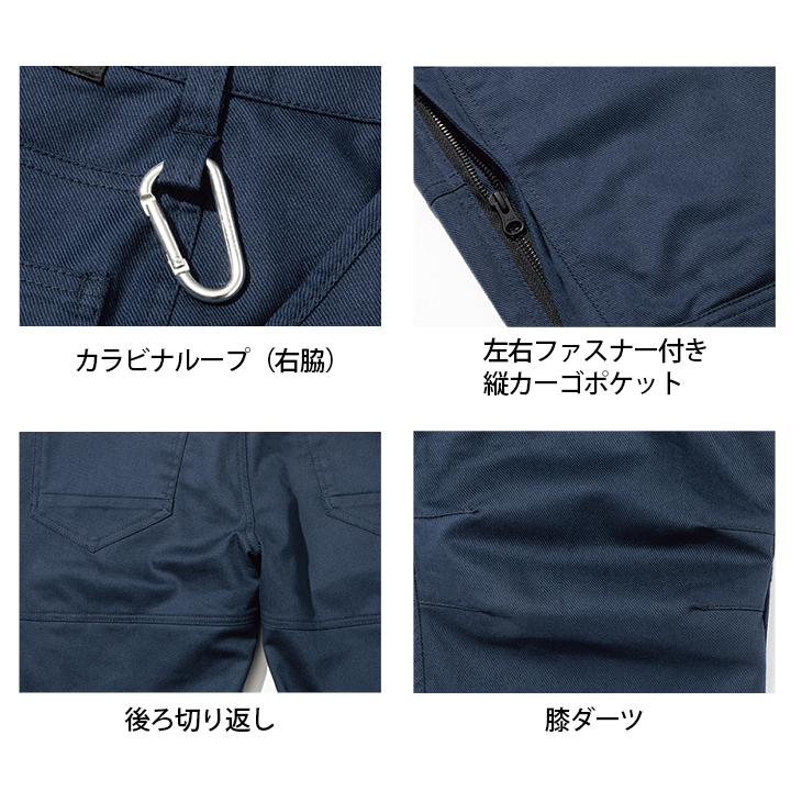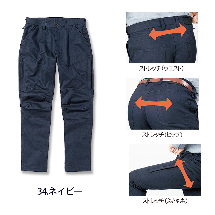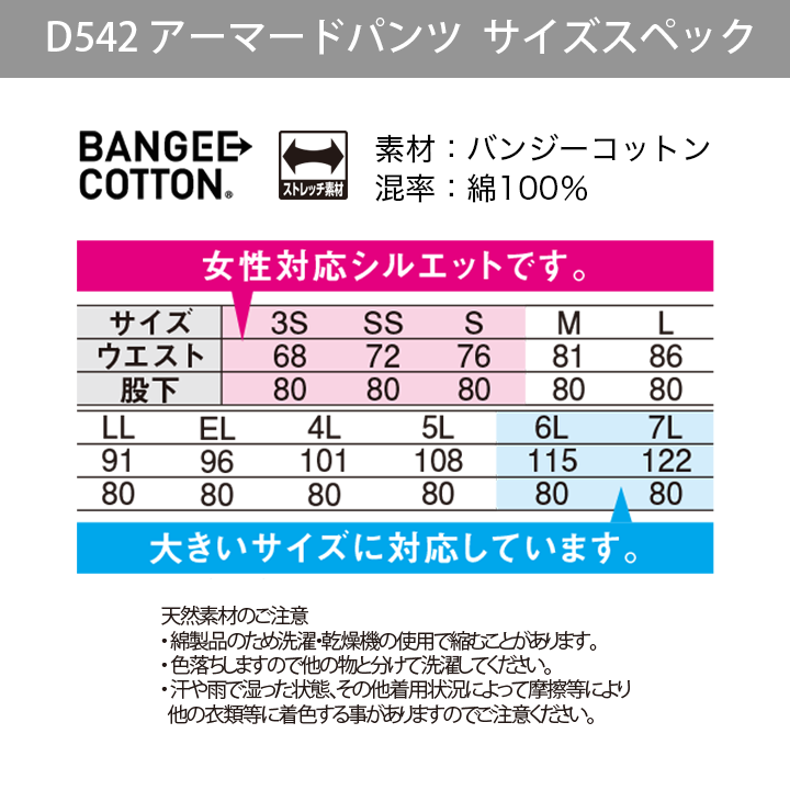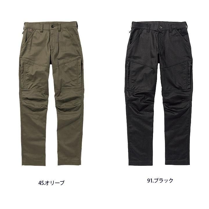 カラーはネイビー、ストーングレー、チャコールグレー、ベージュ、オリーブ、ブラックの6色展開。サイズは3Sから7Lまで幅広く展開。D543エンジニアジャケットとセットアップ可。