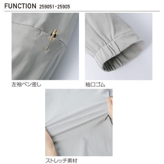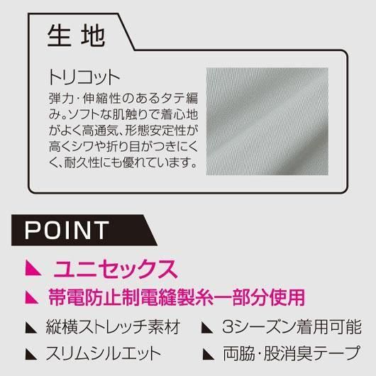 スリムシルエットながら窮屈さを感じさせない縦横ストレッチ素材採用。スラックス&カーゴパンツのウエストは心地良くフィットするバックシャーリング仕様。ジャンパー両脇、スラックス&カーゴパンツの股部分には消臭テープを装備。