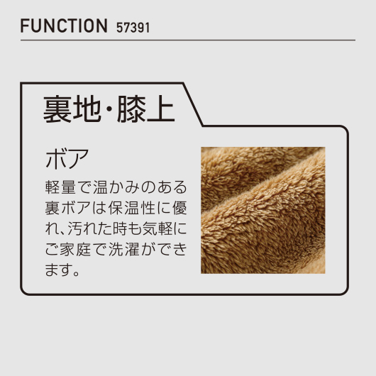 高い耐久性を誇る綿100%のキャンバス生地。無駄を極力省いて機能性を高めた防寒ジャンパー&パンツです。ジャンパーの衿・背中・身頃、パンツの膝上部分は温かく気持ちのいいボアを使用。衿ボアは取り外しも可能です。