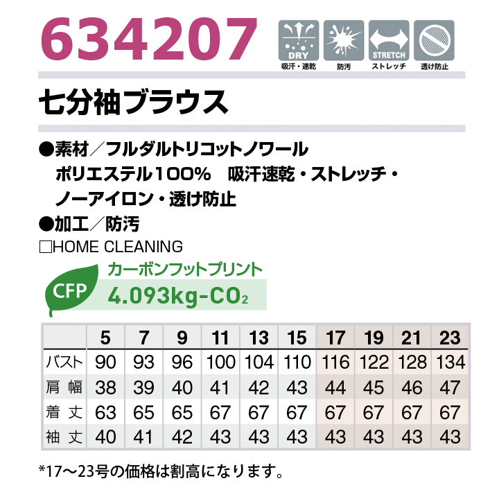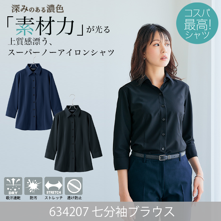 【AITOZ】634207 七分袖ブラウス【レディース】【ノーアイロン】【ストレッチ】【吸汗速乾】【防汚】【透け防止】
