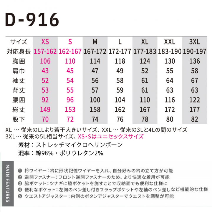 左胸ペン差し付フラップポケットや左袖のペン差しなど機能的な仕様。