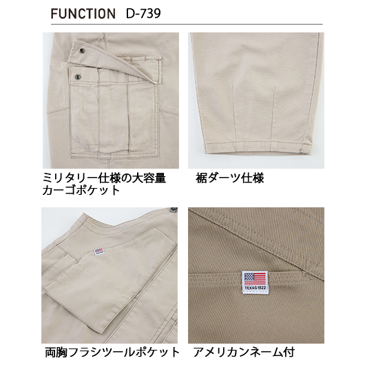 ヨコ伸び伸長率25%以上のアメイジングストレッチオックス生地を採用し、オーバーオール独特の動きにくさを解消。両胸のポケットは底フラシ仕様で、腹部にものが当たりにくく動きやい。