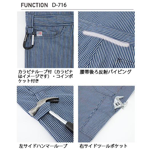 ストレッチを聞かせたヒッコリー。右サイドには工具を入れるツールポケット、左サイドにはハンマーループを装備。ワーカーのための昨日を盛り込みつつカジュアルにも着こなせるスタイル。