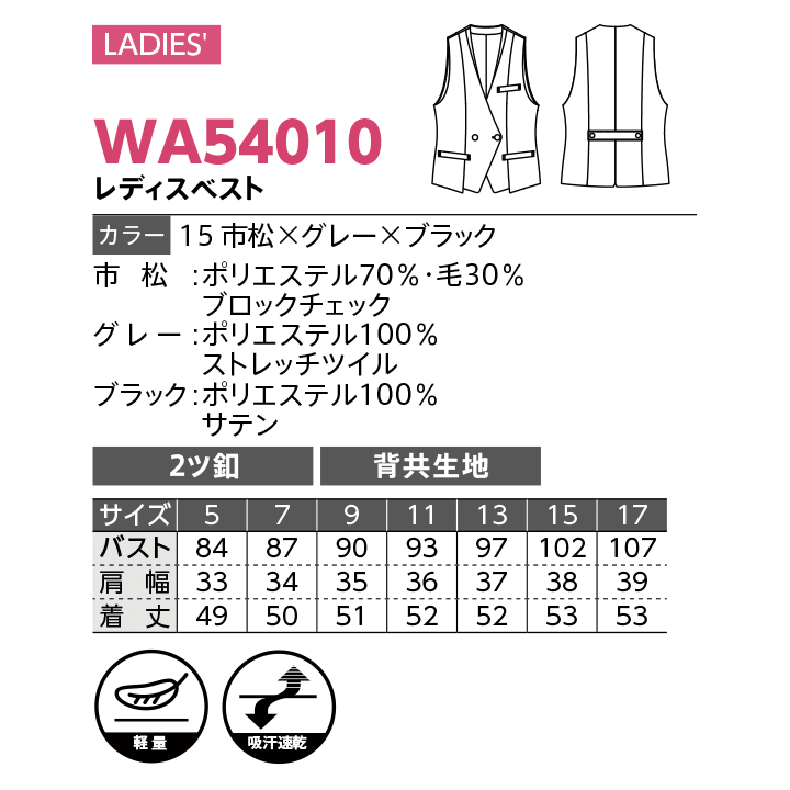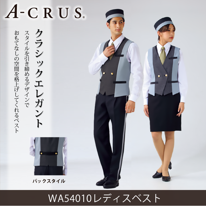 落ち着いた市松模様と衿のサテンのブラックがスタイルを引き締めるデザインでおもてなしの空間を格上げしてくれるベストです。