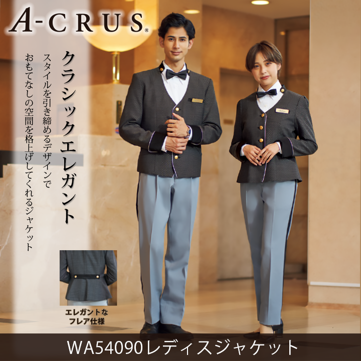 落ち着いた市松模様と衿のサテンのブラックが上質な華やかさを演出し、スタイルを引き締めるデザインでおもてなしの空間を格上げしてくれるベストです。