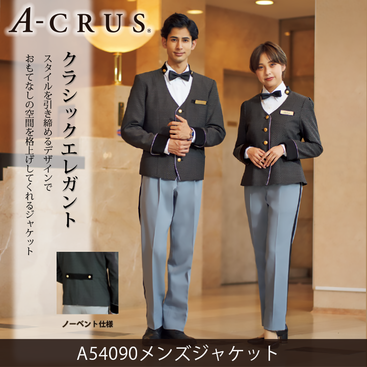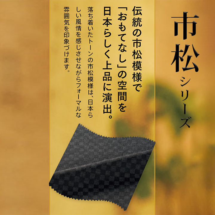落ち着いた市松模様と衿のサテンのブラックが上質な華やかさを演出し、スタイルを引き締めるデザインでおもてなしの空間を格上げしてくれるベストです。