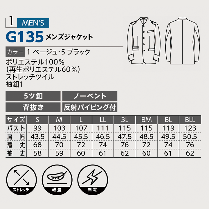 【DALTON】G135メンズジャケット【ストレッチ】【ウォッシャブル】【軽量】【制電】