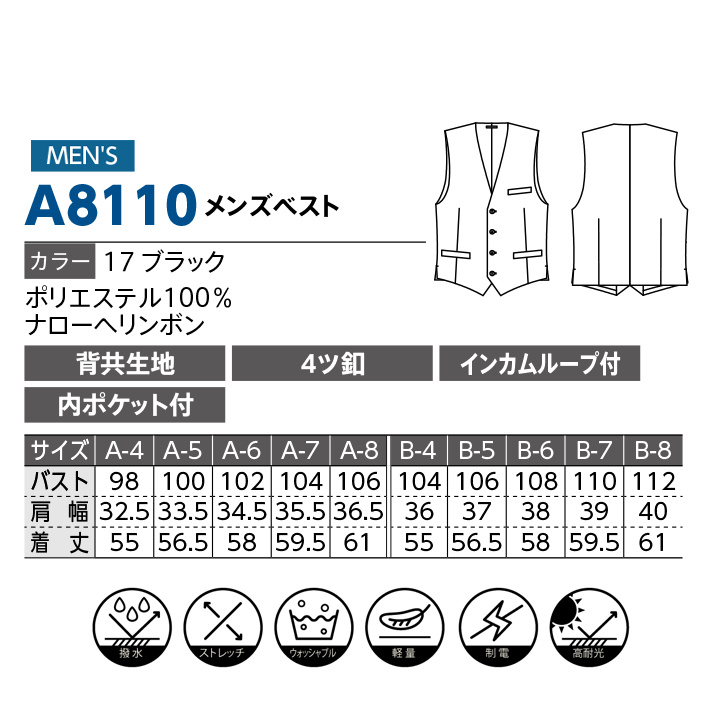 【DALTON】A8110メンズベスト【撥水】【ストレッチ】【ウォッシャブル】【軽量】【制電】【高耐光】