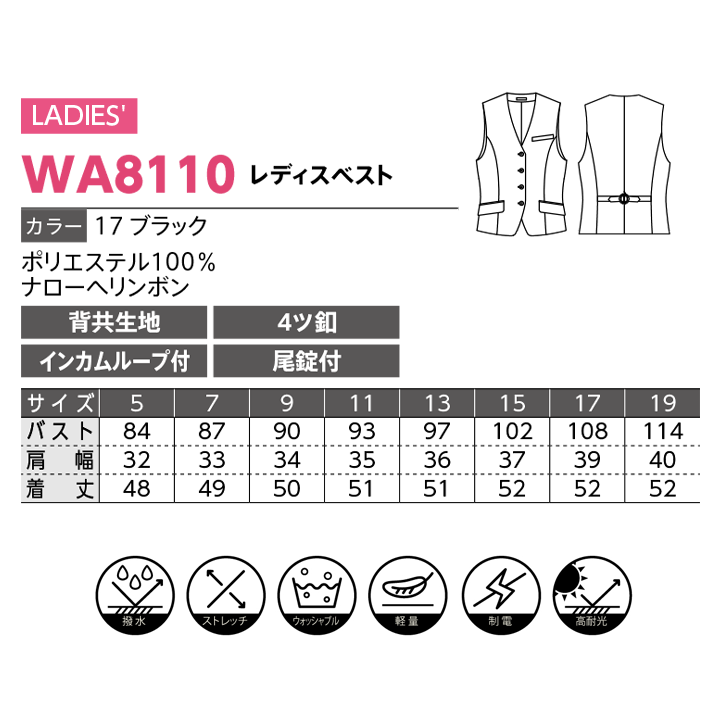 【DALTON】WA8110レディスベスト【撥水】【ストレッチ】【ウォッシャブル】【軽量】【制電】【高耐光】