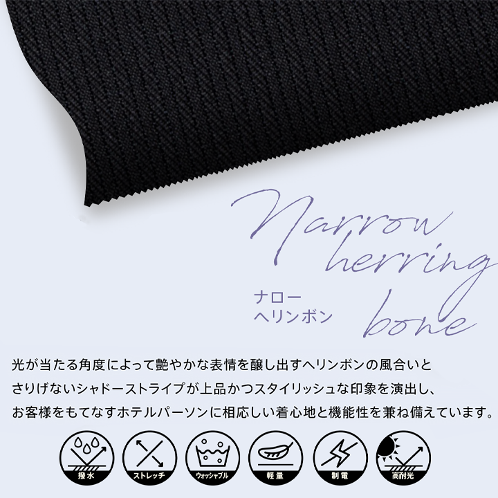【撥水】【ストレッチ】【ウォッシャブル】【軽量】【制電】【高耐光】と多機能素材を使用したスーツ。