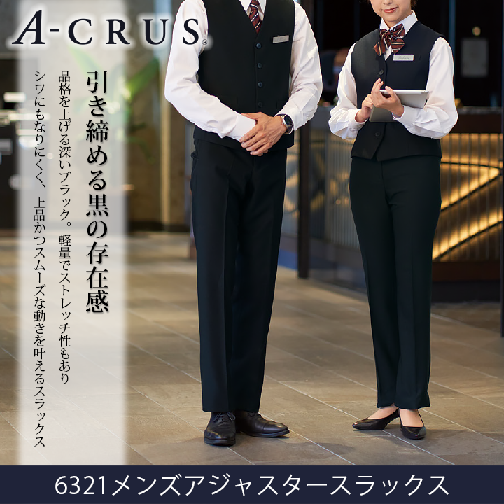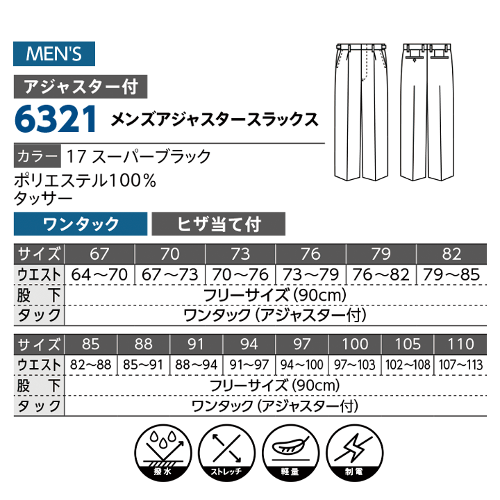 機能性にも優れ軽量で伸縮性がありシワにもなりにくいポリエステルタッサー生地を使用。スラックスはご家庭で洗濯可能。ウエストアジャスターで季節によるウエストの変動にも対応可能。