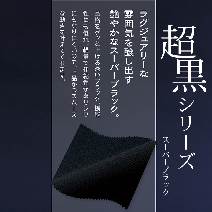 【撥水】【ストレッチ】【ウォッシャブル】【軽量】【制電】と多機能素材を使用したスーパーブラックのスーツ。