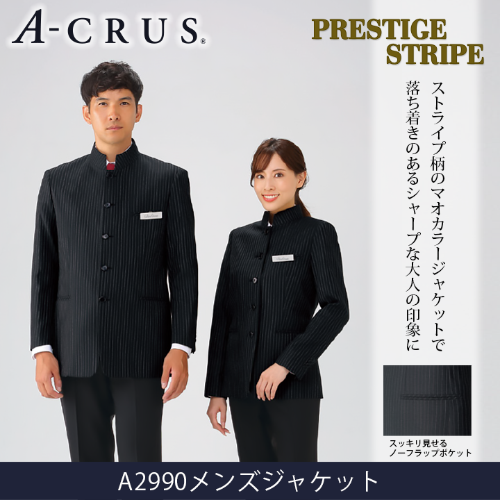 ストライプ柄のマオカラージャケットで落ち着きのあるシャープな大人の印象に。