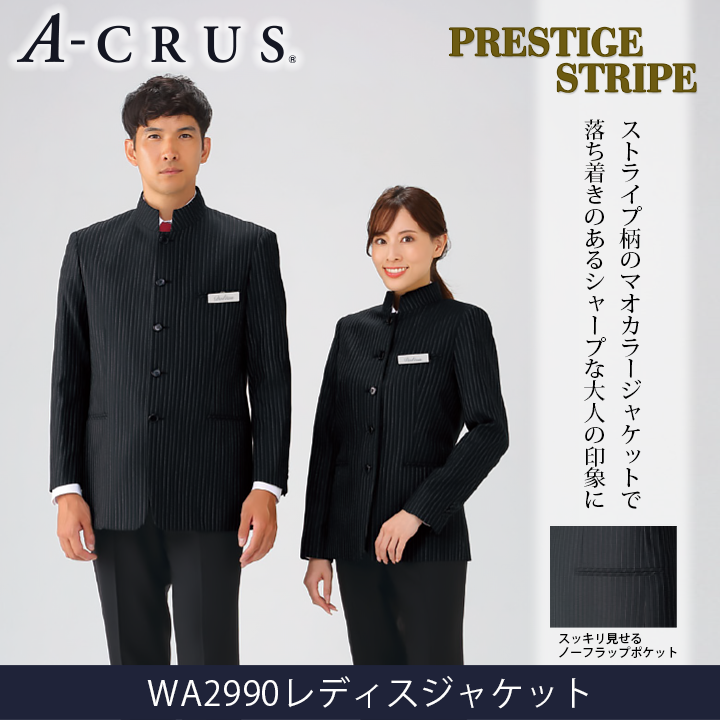 ストライプ柄のマオカラージャケットで落ち着きのあるシャープな大人の印象に。