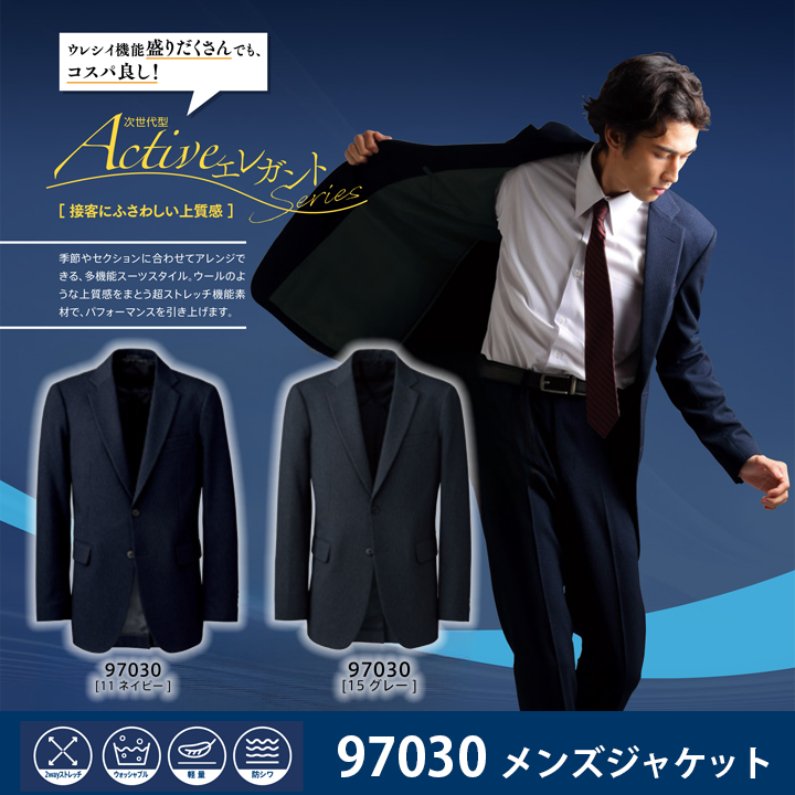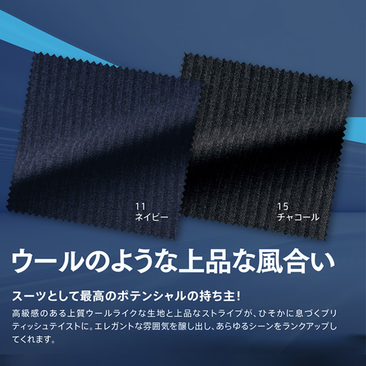 「ストレッチ・ウォッシャブル・軽量・防シワ」もスゴ技機能を搭載。シャドーストライプ柄が艶やかで、エレガントな雰囲気を演出してくれるこれからの時代にふさわしい素材を使用しております。