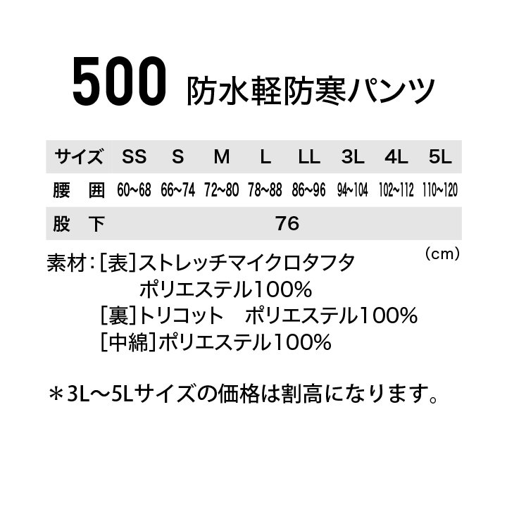 【XEBEC】500防水軽防寒パンツ 【ストレッチ】【防水】【透湿】【保温性】【撥水】
