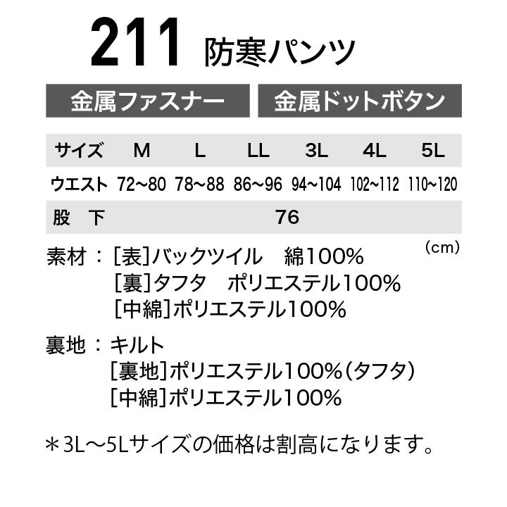 【XEBEC】211防寒パンツ 【綿100%】