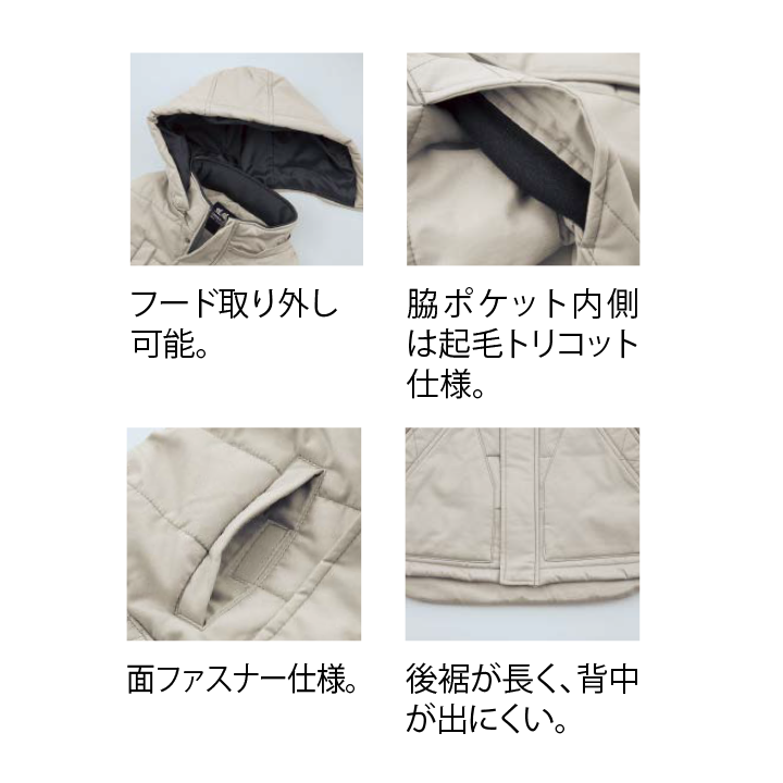 火に強い綿100%の防寒ウェア。フードは着脱可能で土木建築の現場などでも人気のアイテムです。